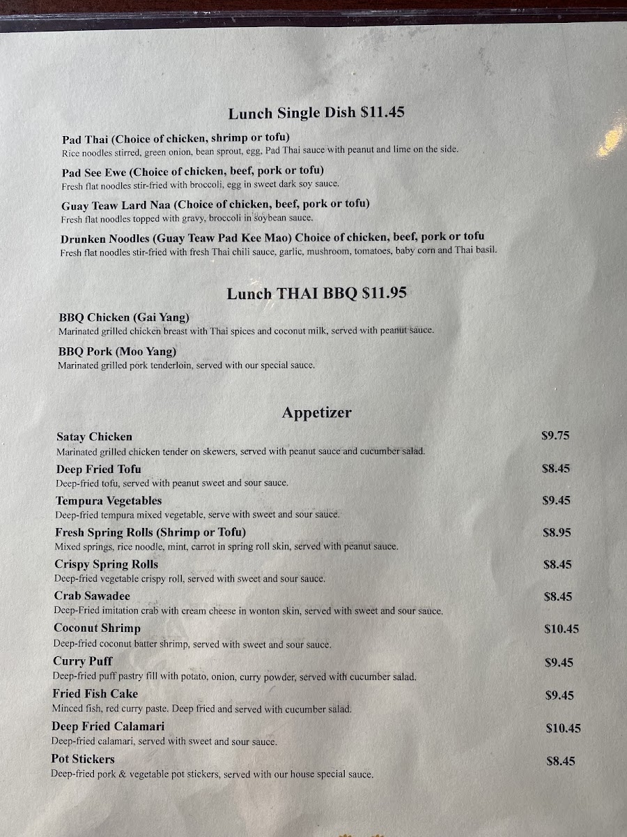 The offerings are suitable for lunch or dinner, and the menu structure supports both quick orders and more leisurely casual dining experiences. Visitors can expect a comprehensive selection of traditional Thai flavors available throughout the day.